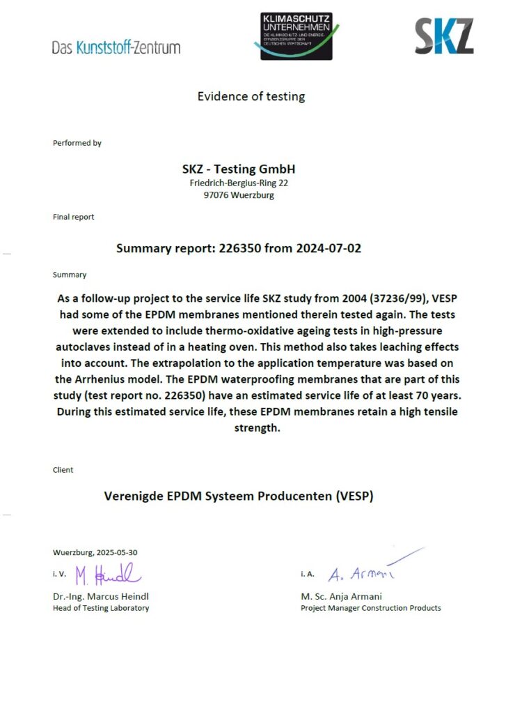 Täielik meelerahu väga pikaks ajaks. RubberGard EPDM katusekatte membraanid pakuvad suurepärast vastupidavust osooni, UV-kiirguse ning ekstreemsete temperatuuride vastu. Rubbergard™ EPDM katuste eluiga on üle 70 aasta. Seda tõestab SKZ-Testing GmbH poolt välja antud sertifikaat.